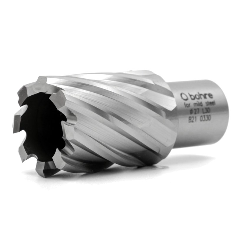 Bohre 27 мм — кольцевая фреза длиной 30 мм. Изготовливается из высококачественной быстрорежущей HSS-стали, которую можно затачивать до 10 раз. Высокая скорость проходки позволяет просверливать до 10 мм в минуту. Хвостовик Weldon подходит для большинства магнитно-сверлильных машин. Для увеличения срока эксплуатации рекомендуется работать со смазочно-охлаждающей жидкостью.