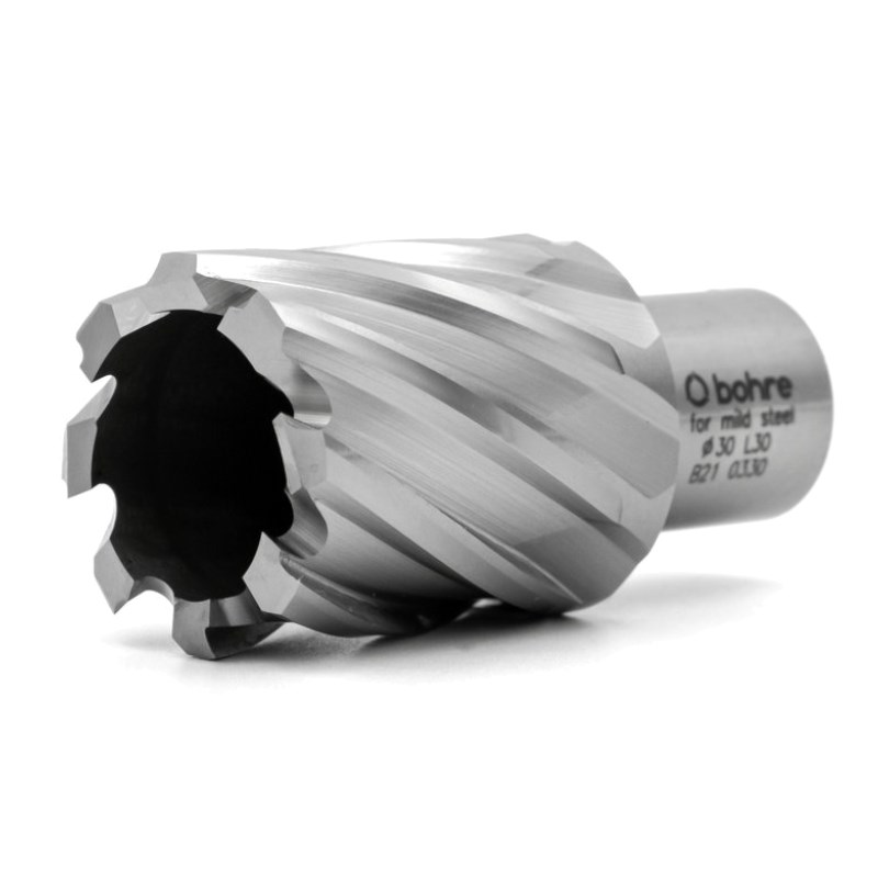 Bohre 30 мм — короткое корончатое сверло длиной 30 мм. Для изготовления используется сталь быстрорежущая типа HSS, которую можно затачивать до 10 раз. Производительность работы достигает до 10 мм/мин. Посадочное отверстие Weldon подходит для большинства магнитных сверлильных машин. Для увеличения срока эксплуатации советуем работать с СОЖ.