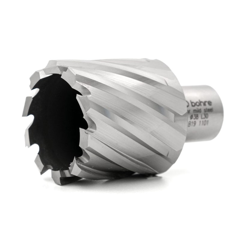 Bohre 38 мм — кольцевая фреза длиной 30 мм. Для изготовления используется HSS-сталь (быстрорежущая), которую можно затачивать до 10 раз. Скорость работы достигает до сантиметра в минуту. Посадочное отверстие Weldon подходит для большинства сверлильных станков по металлу. Для увеличения срока эксплуатации рекомендуем работать со смазочно-охлаждающей жидкостью.