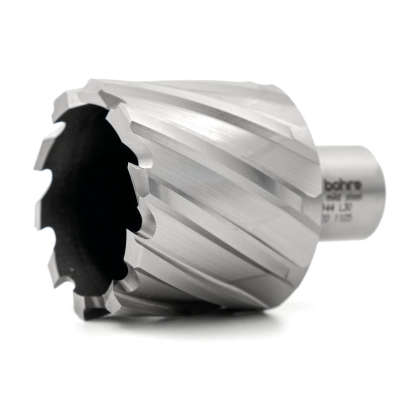 Bohre 44 мм — короткая кольцевая фреза длиной 30 мм. Для изготовления применяется HSS-сталь (быстрорежущая), которую можно затачивать до 10 раз. Скорость работы достигает до 10 мм/мин. Посадка Weldon подходит для большинства сверлильных станков по металлу. Для продления срока эксплуатации рекомендуем работать с СОЖ.