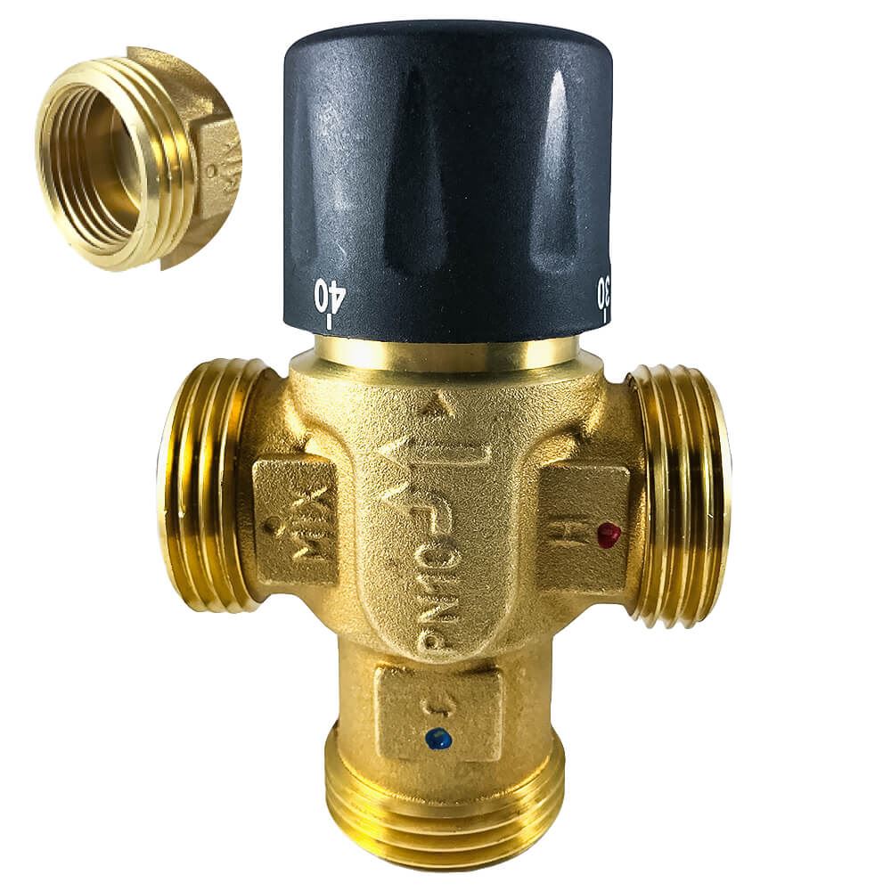Смесительный термостатический клапан имеет два входа для подвода смешиваемых сред и один выходной (боковой). В клапан встроен перенастраиваемый термостатический элемент, поддерживающий в зависимоститемпературу теплоносителя в диапазонах 20 – 55 °С.