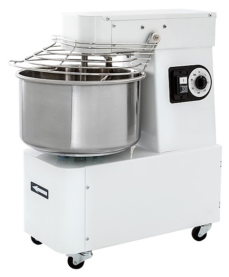 Тестомес спиральный имеет в своей конструкции дежу, спиралевидный месильный орган, тесторазделительный стержень, крышку, колеса, приводной механизм и крюк из нержавеющей стали. Оборудование оснащено таймером. Крышка оборудована предохранительным микровыключателем.