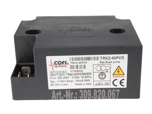 Описание | Трансформатор поджига Cofi TRK2-40PVD участвует в процессе зажигания топливной смеси. Генератор высоковольтного напряжения от итальянского производителя произведен по стандартам безопасности и качества. Предназначен для оснащения узла розжига котлов различного назначения. Особенности Трансформатор поджига преобразует сетевое 230-вольтовое напряжение в ток высокого напряжения, 1x15 кВ, который подаётся на поджигающий электрод. С помощью высоковольтного электрического разряда обеспечивается быстрое и безопасное воспламенение топливовоздушной смеси в момент запуска горелки. При изготовлении конструкции использована качественная тепло-, электроизоляция, что обеспечивает стабильную и безопасную работу устройства. Корпус произведен из ударостойкого пластика. Предусмотрены штекерные разъемы для надежного подключения кабелей поджига и провода электропитания. Характеристики:
