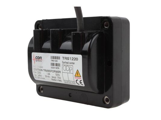 Трансформатор поджига Cofi TRS1220 преобразует входящий ток (230 В) в ток высокого напряжения (2x6 кВ) для подачи на электроды и воспламенения топливной смеси высоковольтной искрой. Устройство является частью узла розжига котла отопления или другой тепловой установки. Компактный, износостойкий корпус выполнен из ударопрочного пластика с учетом условий эксплуатации. Конструкцией предусмотрено два выхода высокого напряжения. В комплект входит провод электропитания длиной 380 мм. Подсоединение кабелей поджига осуществляется с помощью винтовой нарезки.