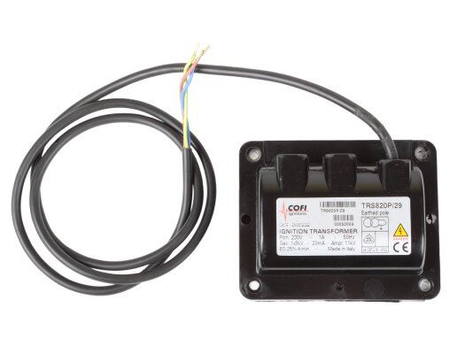 Трансформатор поджига Cofi TRS820P/29, необходим для выработки высоковольтного напряжения, подаваемого на электрод поджига. Преобразователь тока произведен по европейским стандартам качества и надежности. Повышает входной ток 230 В до 1x8 кВ. Благодаря генератору искры происходит воспламенение топливовоздушной смеси высоковольтным разрядом и быстрый розжиг горелки. Трансформатор характеризуется бесперебойной работой, компактными габаритами, безопасным исполнением. Рабочий узел помещен в пластиковый корпус. Для надежного контакта с кабелями поджига предусмотрены штекерные разъемы. Комплектация включает кабель питания 1140 мм. Модель является аналогом Fida Compact 8/20 PM, арт. TE084D.