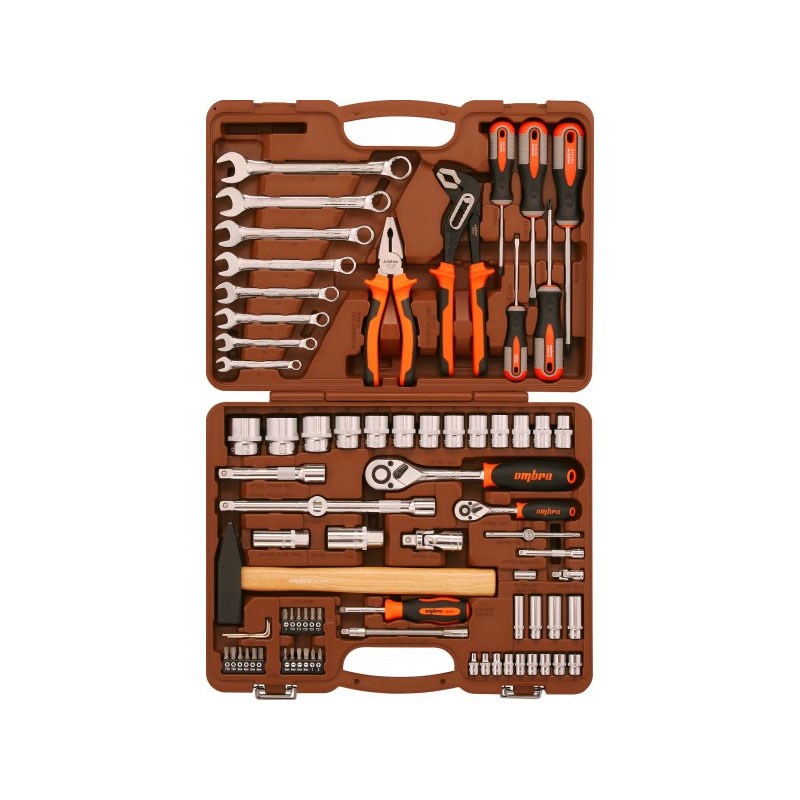 Универсальный набор инструментов OMBRA OMT77S предназначен для соединения резьбовых креплений, а также обслуживания транспорта. Используется в мастерских, на СТО, в быту и на стройплощадках. Состоит из 77 комплектующих. В составе изделия с соединением 1/4 и 1/2 дюйма: 12-тигранные и свечные головки, трещотка, комбинированные ключи, шестигранники, удлинители, вороток, шарнир, переходники, отвертки, биты, битодержатель, пассатижи, клещи, молоток. Комплект поставляется в высокопрочном кейсе с защелками для удобства хранения и переноски. Стальные инструменты защищены от образования ржавчины специальным покрытием.