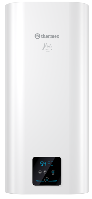 Водонагреватели Thermex серии MINTA предлагаются с вместимостью 30, 50, 80 и 100 литров. Ассортимент линейки включает в себя электрические накопительные модели вертикального размещения, с функцией автоматической диагностики и защитой от замерзания. На съемном фланце установлен сухой нагревательный элемент InoxDryHeat, а также датчики термостата и термовыключателя.