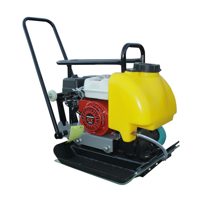 Оборудована надежным бензиновым двигателем Хонда. Стальная плита обладает повышенной износостойкостью. Встроенный водяной резервуар увлажняет поверхность подошвы. Колеса упрощают перевозку устройства в месте эксплуатации. В набор входит сварная рама для транспортировки изделия краном.