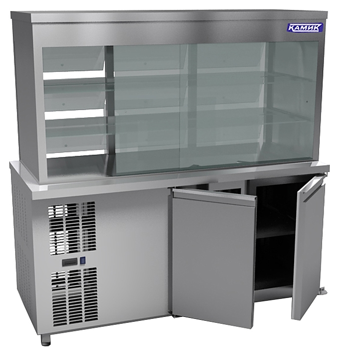 Холодильная витрина КАМИК ВХ-18070 используется на предприятиях общественного питания и торговли для охлаждения, демонстрации и кратковременного хранения продуктов питания и готовых блюд. Модель оснащена подсветкой. Нижняя часть конструкции разделена на секции, каждая из которых оборудована распашной дверью, сетчатой полкой и парой направляющих. В правой части конструкции расположен холодильный агрегат. Корпус выполнен из нержавеющей стали AISI 430 и AISI 304 толщиной 1 мм, полки - из стекла.