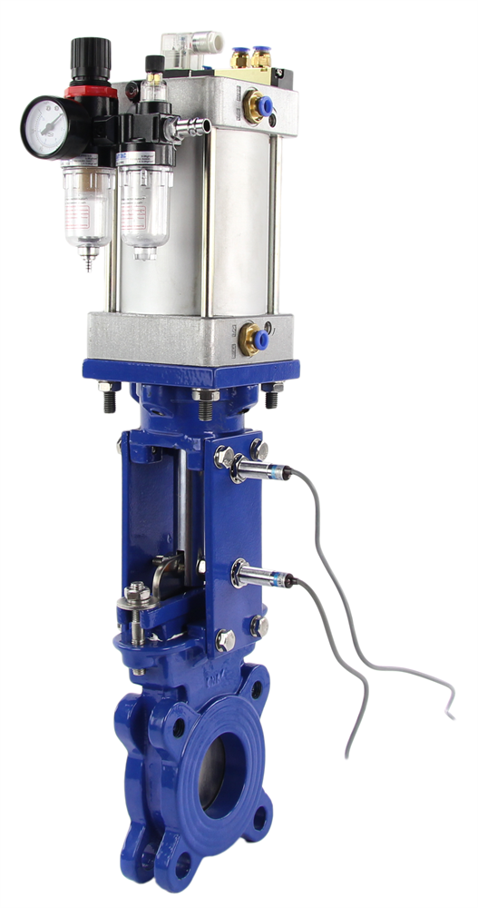 Задвижка шиберная DN GVKR3431M-1W-Fb-2P Ду200 Ру10 межфланцевая, клин - однодисковый, шпиндель - выдвижной, корпус - сталь, уплотнение - металл, с пневмоприводом, пневмораспред. 4V210-08220В, индукц. датчиками LJ12A3-4-J, возд. фильтром AFC2000