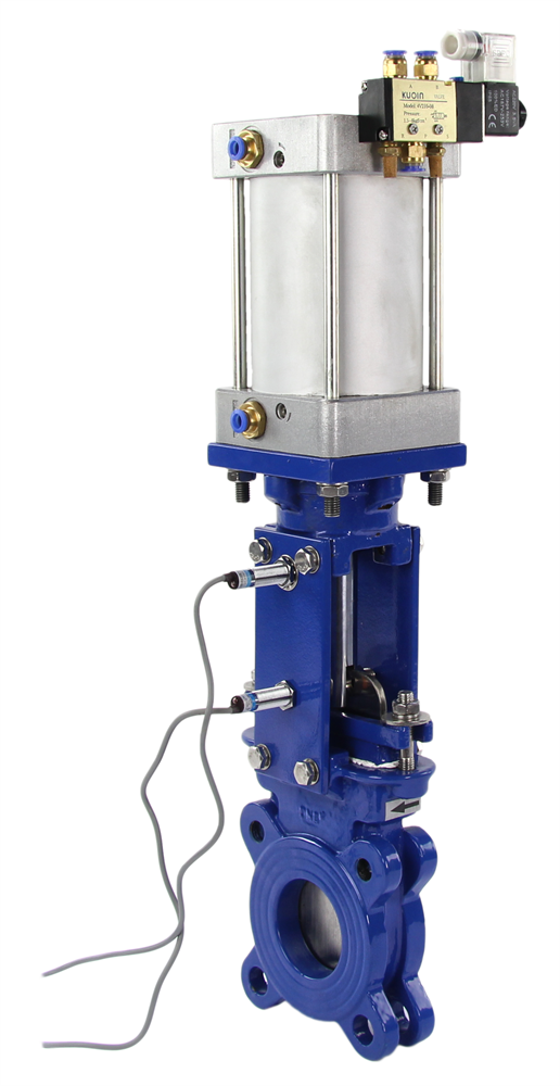 Задвижка шиберная ножевая DN GVKR1331E-2W-Fb-2P Ду200 Ру10 двусторонняя, межфланцевая, клин - однодисковый, шпиндель - выдвижной, корпус - чугун, уплотнение - EPDM, с пневмоприводом, пневмораспределителем 4V210-0824В, индукционными датчиками LJ12A3-4-J